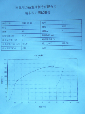 的13mm、16mm兩種規格的拉力檢測報告。為您展示辰力公司在起重鏈條生產制造方面的能力,歡迎廣大客戶蒞臨我公司參觀指導。聯系電話: 0312-8037111(辦公室)